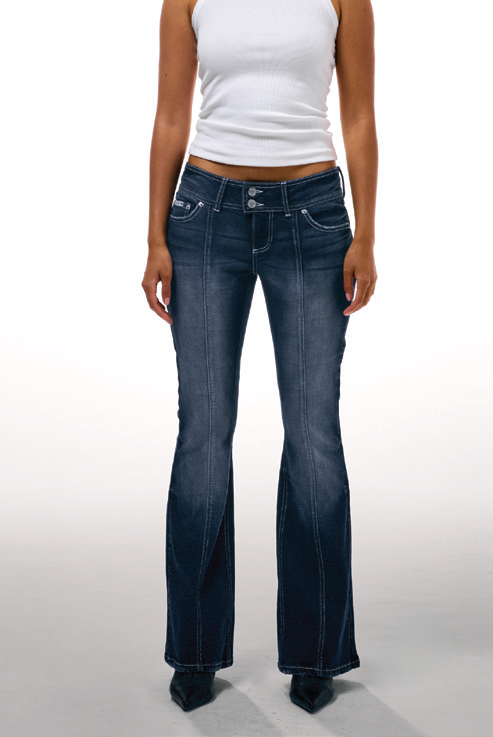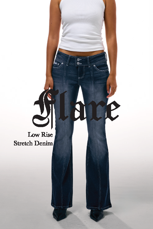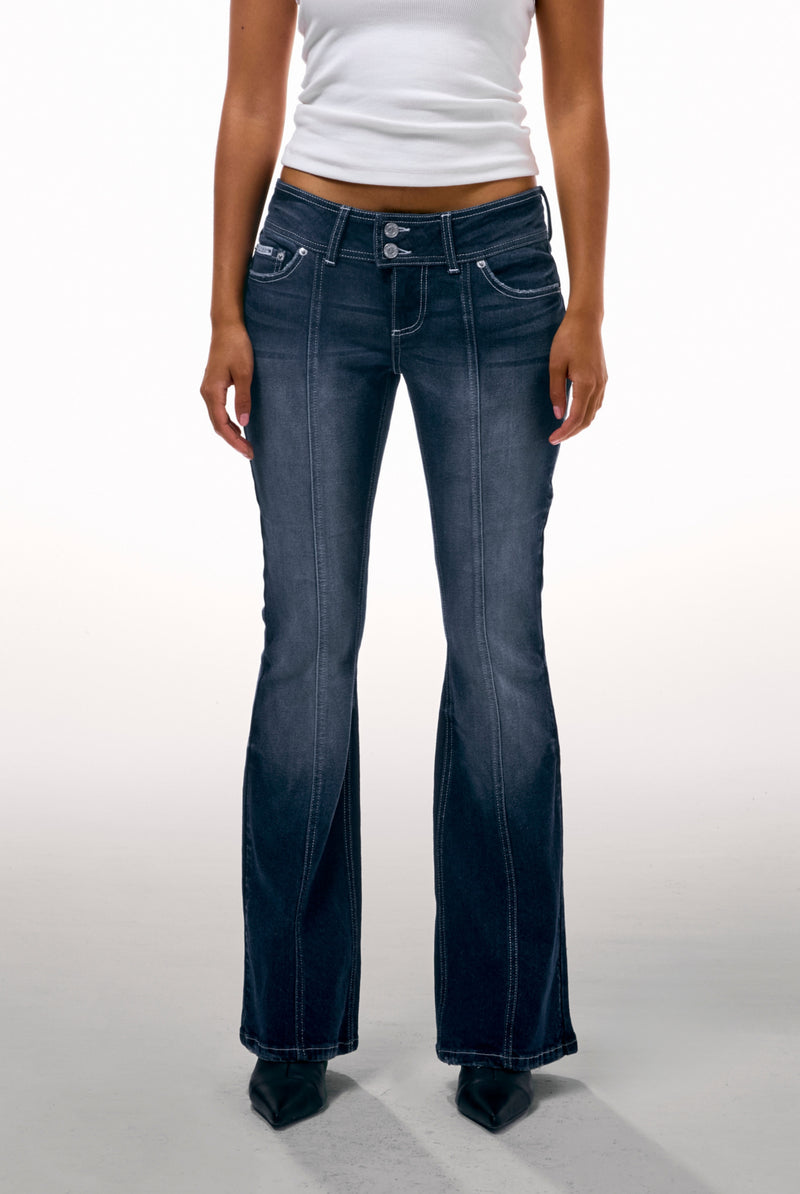 Sitting low on the hips, slim through the thigh and wide at the hem, our flared leg jeans offer the ultimate y2k style. Nostalgic and feminine.