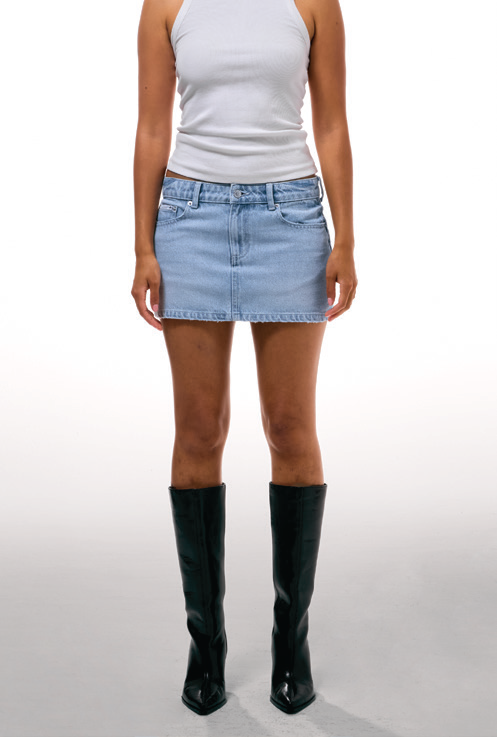 Sitting low on the hips, the mini skirt bodies the ultra-feminine yet rebellious energy of the y2k era. A straight yet short fit offers a sleek silhouette on the hips, showcasing a playful leg lengthening profile.